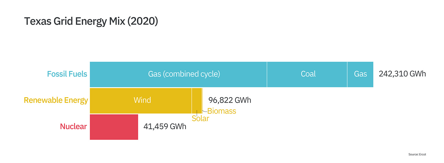 As shown below, the independently operated Texas electricity grid is powered by primarily fossil fuels, with only around 25% of the total coming from renewables.