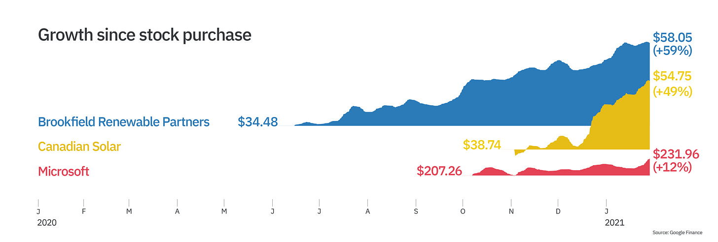 For this newsletter, we used two different datasets for two different charts. For the Texas Grid Energy Mix, we charted the total GWh for 2020 broken down by energy type. The dataset is from Ercot. For the Growth since stock purchase, we used Google Finance data for each stock since the date we bought the stock until Jan 31, 2020. We visualized the data by using a one-week moving average of the total daily percent change for each holding. The percent change from stock purchase to Jan 31, 2020 is based on the one-week moving average not the % change from stock purchase to Jan. 31, 2020.